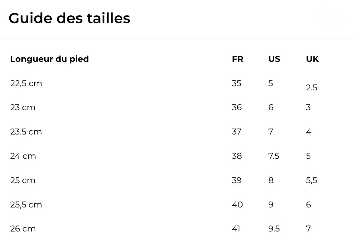 Notre conseil taille :  Choisir votre pointure habituelle. Entre 2 tailles, choisir la plus grande. Pied large, choisir une taille de plus.